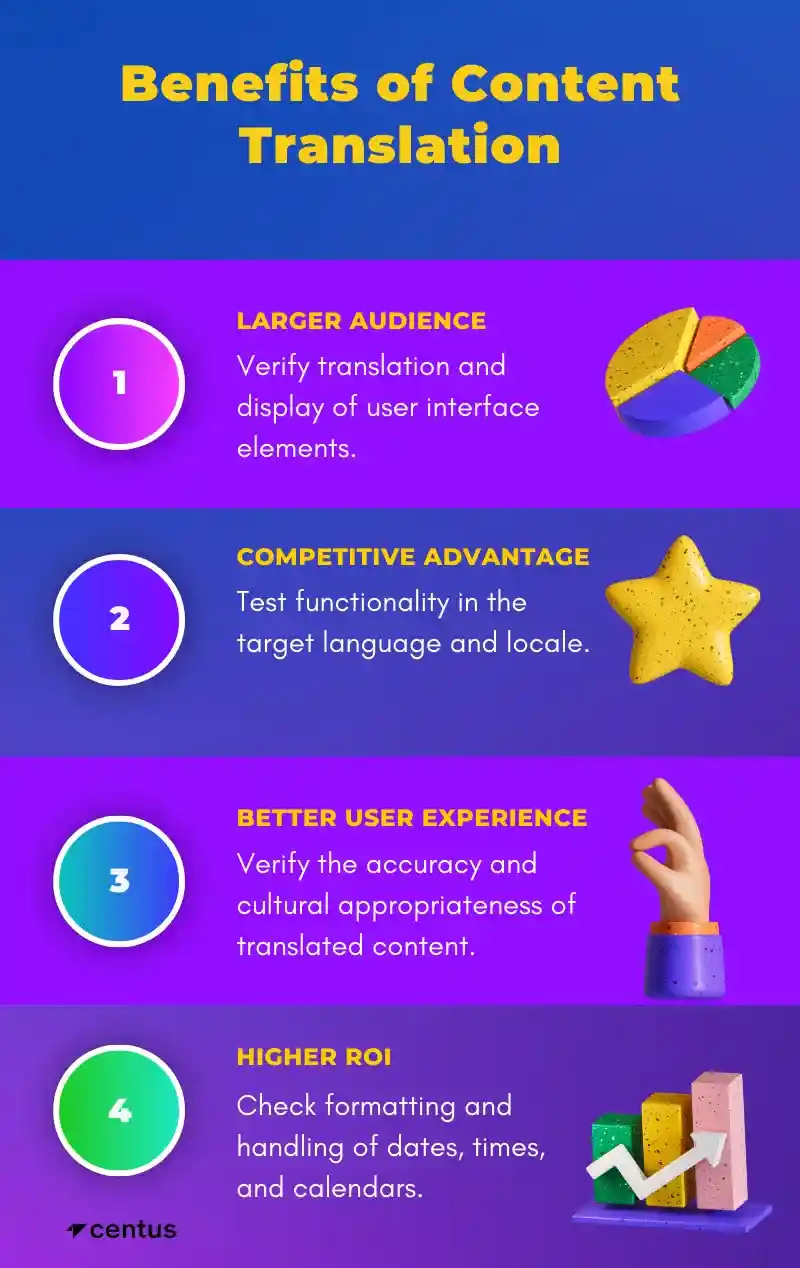 Using content translation services delivers numerous benefits, including enhanced communication with multilingual audiences, improved SEO for translated content, and the ability to localize your message to suit diverse cultural contexts.