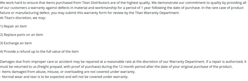 After a claim is filed, Titan will evaluate it and decide if the product will be repaired or replaced. Customers should be aware that Titan maintains discretion in these decisions and that their warranty repair process is built around fairness and adherence to the guidelines laid out in the warranty terms.